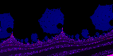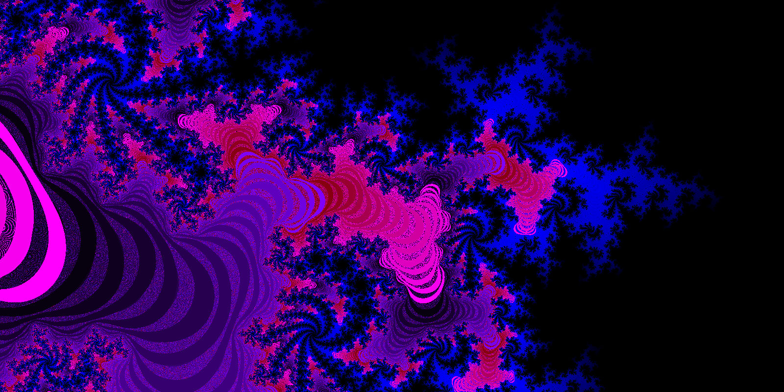 The very basic principle of border detection is simple: when you run across a black pixel, go to the next pixel that is black but touching a colored pixel. While doing this, never backtrack. When you come across where you started, the curve is closed, and you can then shade the inside. There’s a few inherent problems to this- the largest is that we’re taking discrete samples of a fractal, where edges are infinitely complex. Very fine detail can make a curve look closed, when in reality there’s a sliver that’s just not visible due to sample resolution. Take below as an example. There’s blue spots enclosed within the edge.