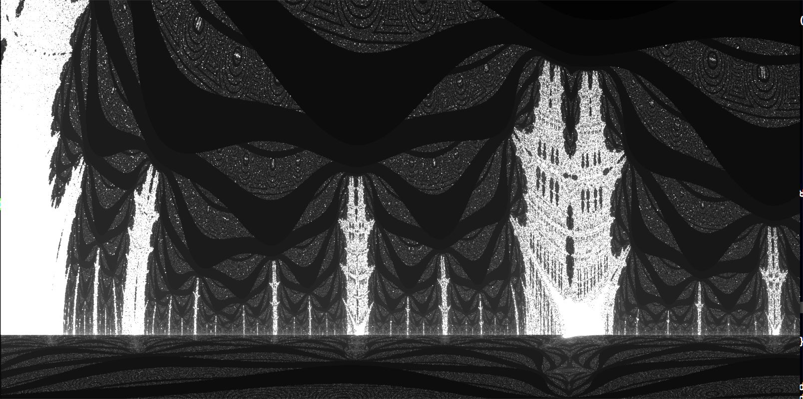 While experimenting with decimal placement, I shifted the decimal too much to the left. I haven’t taken the time to fully understand how, but this introduced some really aesthetically pleasing bugs. I don’t fully comprehend why the bands form. Because numbers get clipped above a certain threshold, this decimal placement also creates copies of the mandelbrot set scattered throughout the complex plane in a way I think is really fun to explore.